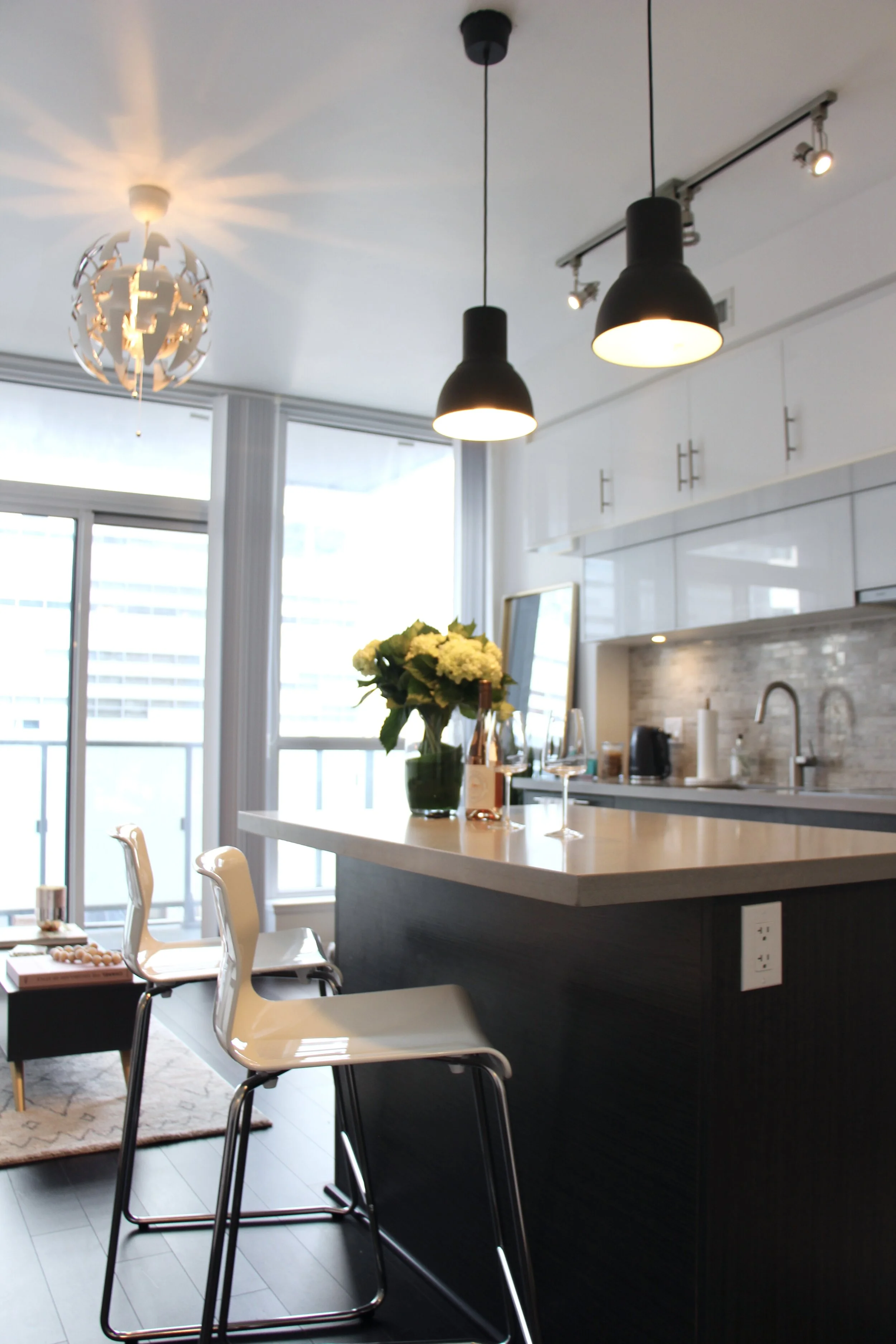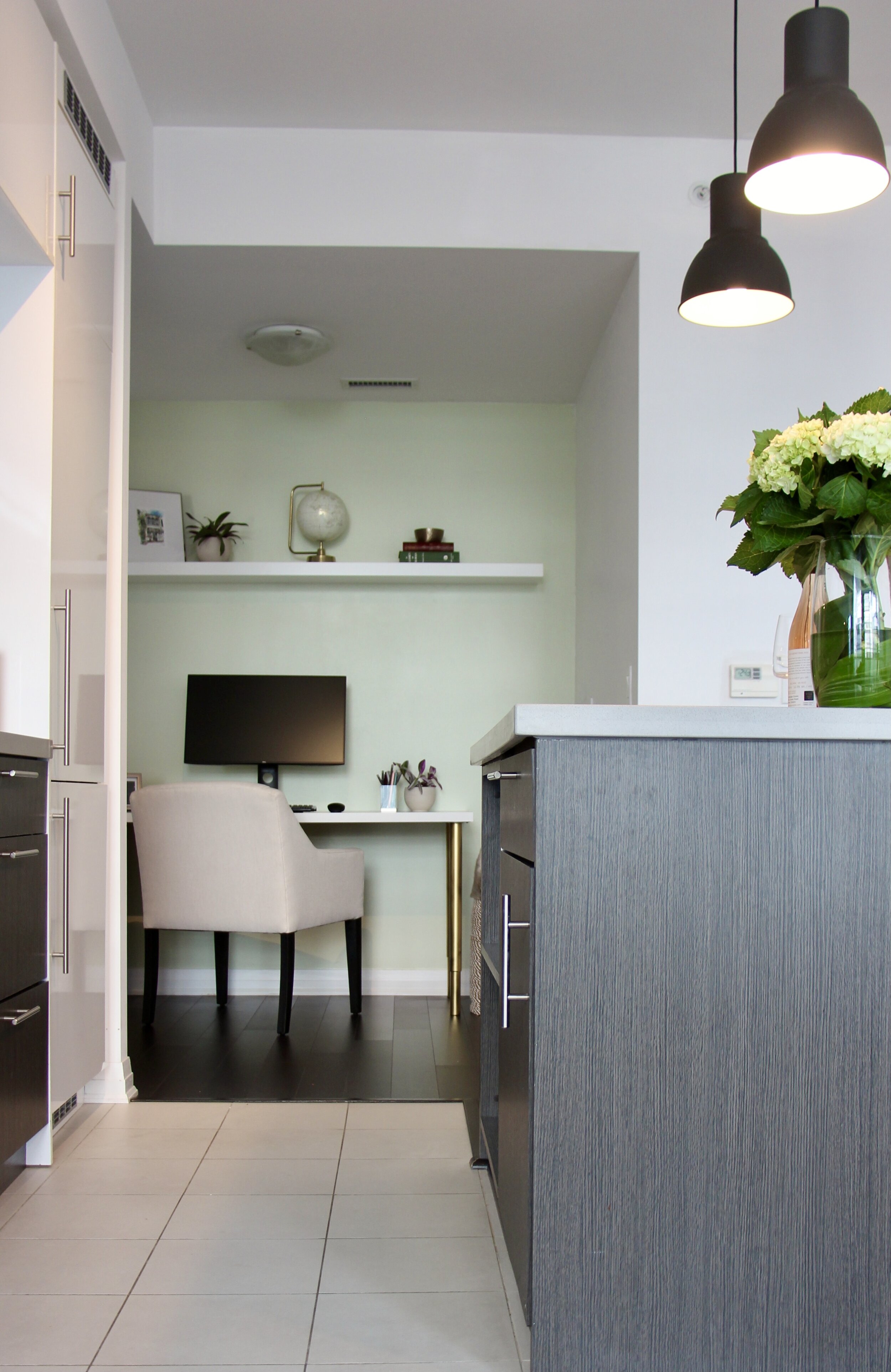 When our client’s job brought her downtown, leasing a condo close to work was of the utmost importance. Being the first place to call her own, our job was to furnish and organize the entire space while remaining on a budget for this young professional. Our goal was to create a home for her to feel comfortable and safe, including a designated work area. Working with an accented achromatic colour scheme, we incorporated hints of green into the blacks, whites, and greys offered by the build of the condo. Green serves as a symbol of wealth and prosperity, in addition to offering qualities of security and emotional balance – perfect for a relaxing retreat that duals as a work-from-home space!